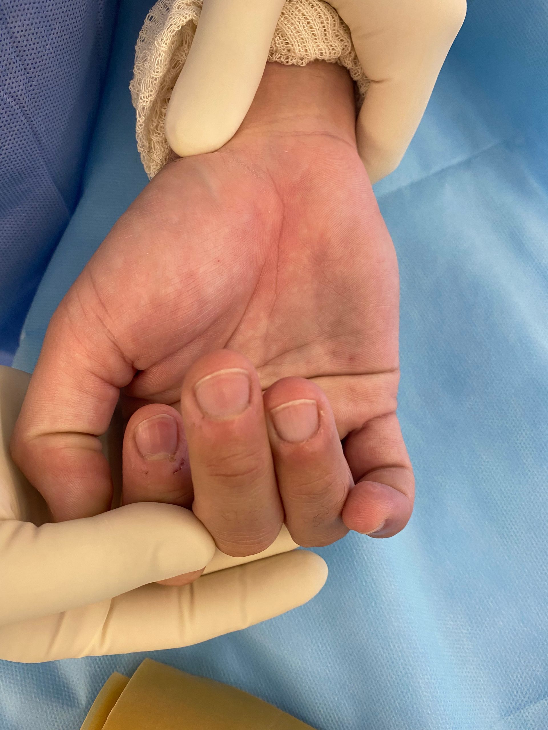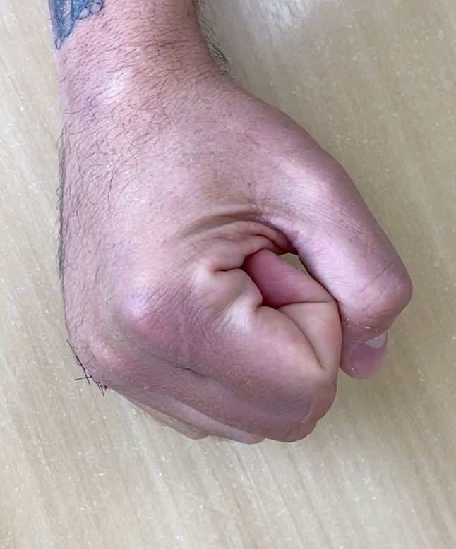 O exame físico será crucial para determinar a presença de lesões na pele causadas por mordedura humana (também denominado de "fight bites" que são lesões causadas pelos dentes da pessoa agredida, voluntária ou involuntariamente), além do status neurovascular, presença de pseudo garra e desvio rotacional.