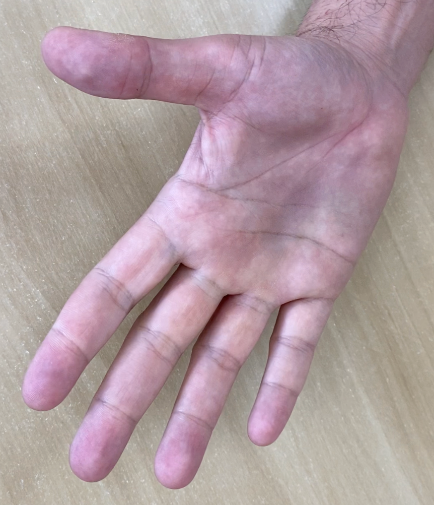 desaparecimento da 4ª e/ou 5ª junta da mão associado ao quadro de dor.