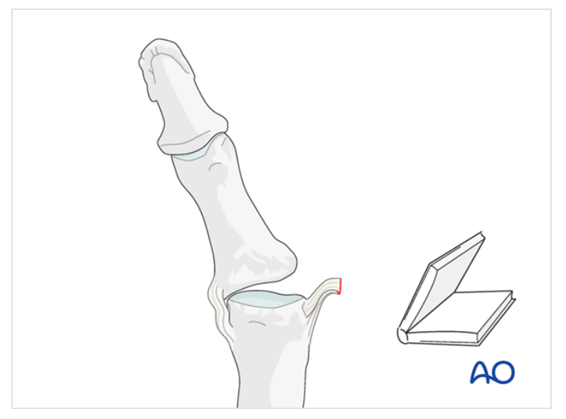 Radiografia evidenciando avulsão de fragmento articular da base da falange proximal; representação esquemática de uma fratura avulsão do metacarpo e da base da falange proximal.Parágrafo Novo