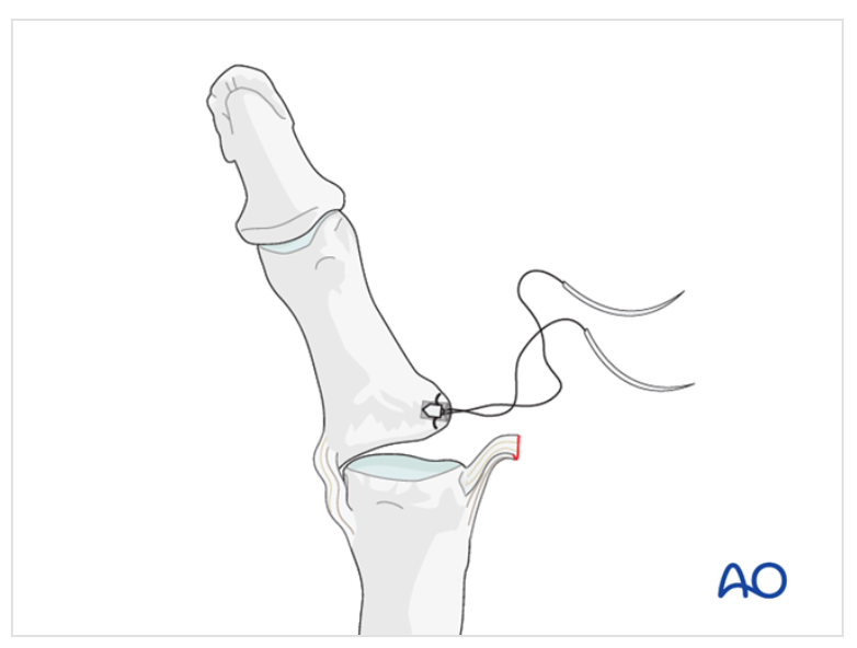Passos cirúrgicas para reinserção do ligamento colateral ulnar, na lesão de Stener. 1) Abdução da falange para máxima visualização da articulação (como um livro aberto). Nesse momento será realizada irrigação articular com soro fisiológico e a busca por lesões associadas. 2) Identificação do sítio de inserção do ligamento colateral, também chamado de "footprint". Deverá ser realizada uma perfuração para introdução da âncora, se atentando para inserção mais volar para prevenção de subluxação rotatória da articulação. 3) Inserção da âncora, que pode ser flexível ou metálica. 4) Utilização das âncoras para posicionamento da porção avulsionada do ligamento.