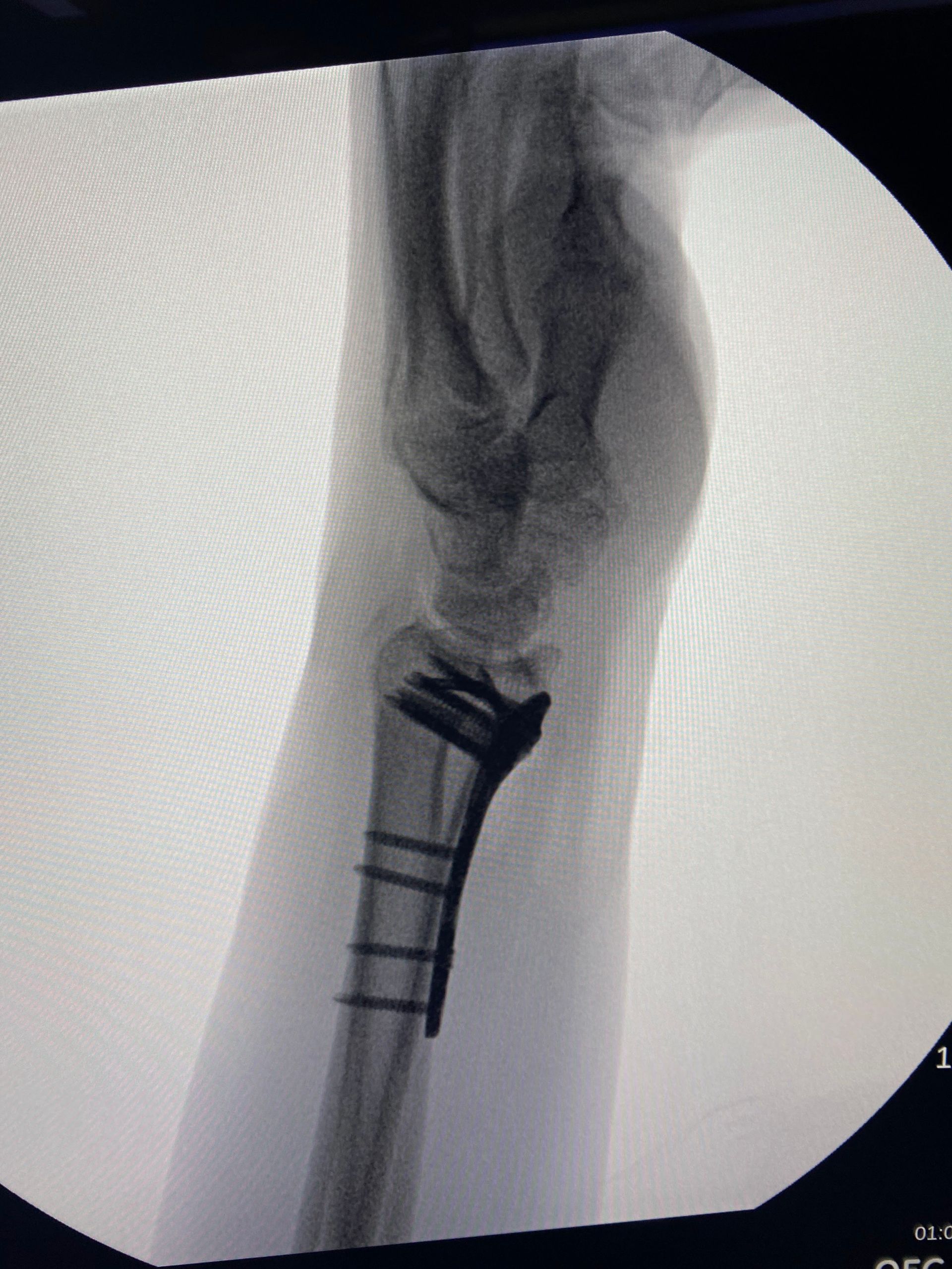 - Após redução de tais fragmentos, uma placa de distração será utilizada fixando, preferencialmente a base do 2 metacarpo (mas o 3° metacarpo também pode ser utilizado);